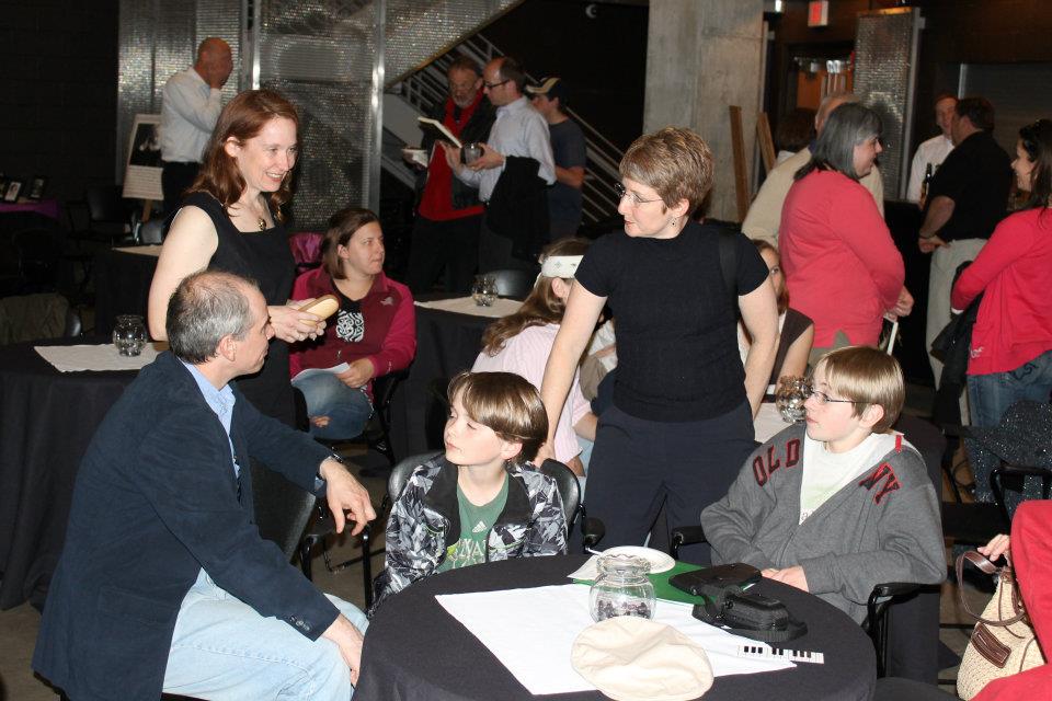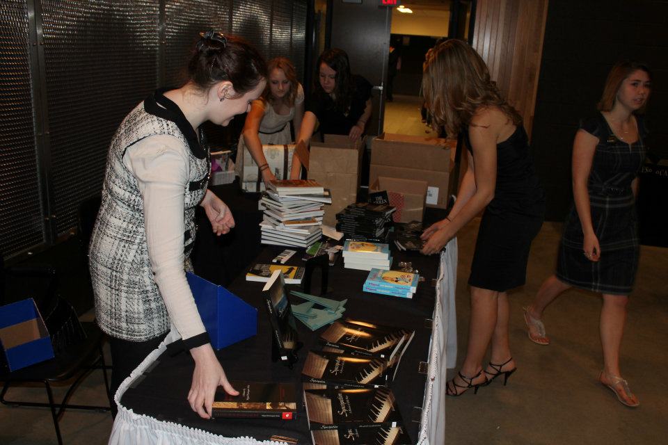 Cornerstone Press staff setting up the book table. In addition to Syncopation, other Cornerstone titles were available, as was The Stolen Goldin Violin.