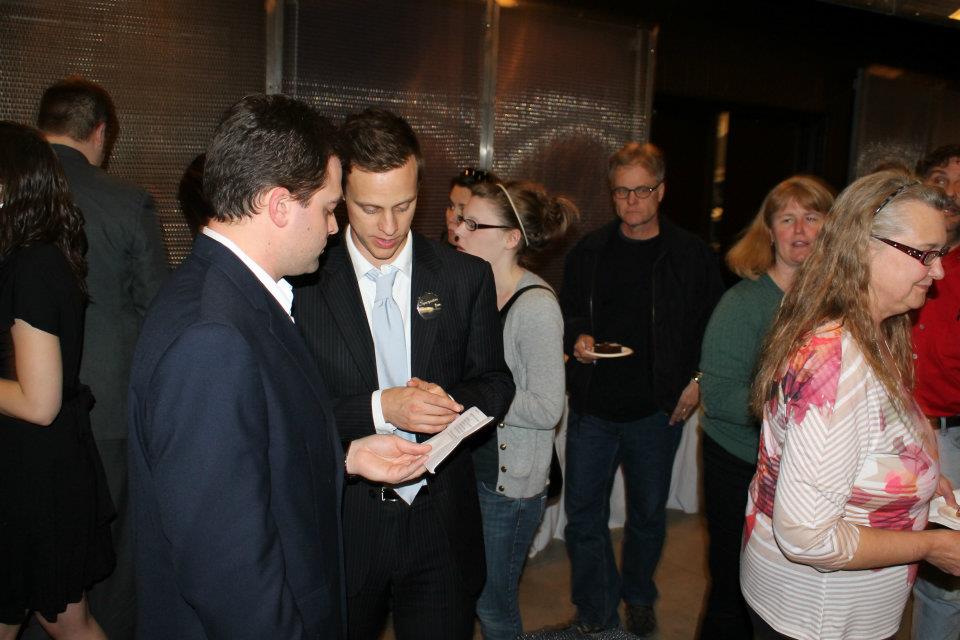 Boone Sorenson (program emcee, on left) and Per Henningsgaard (Cornerstone editor-in-chief, in center) discuss the order of the program.