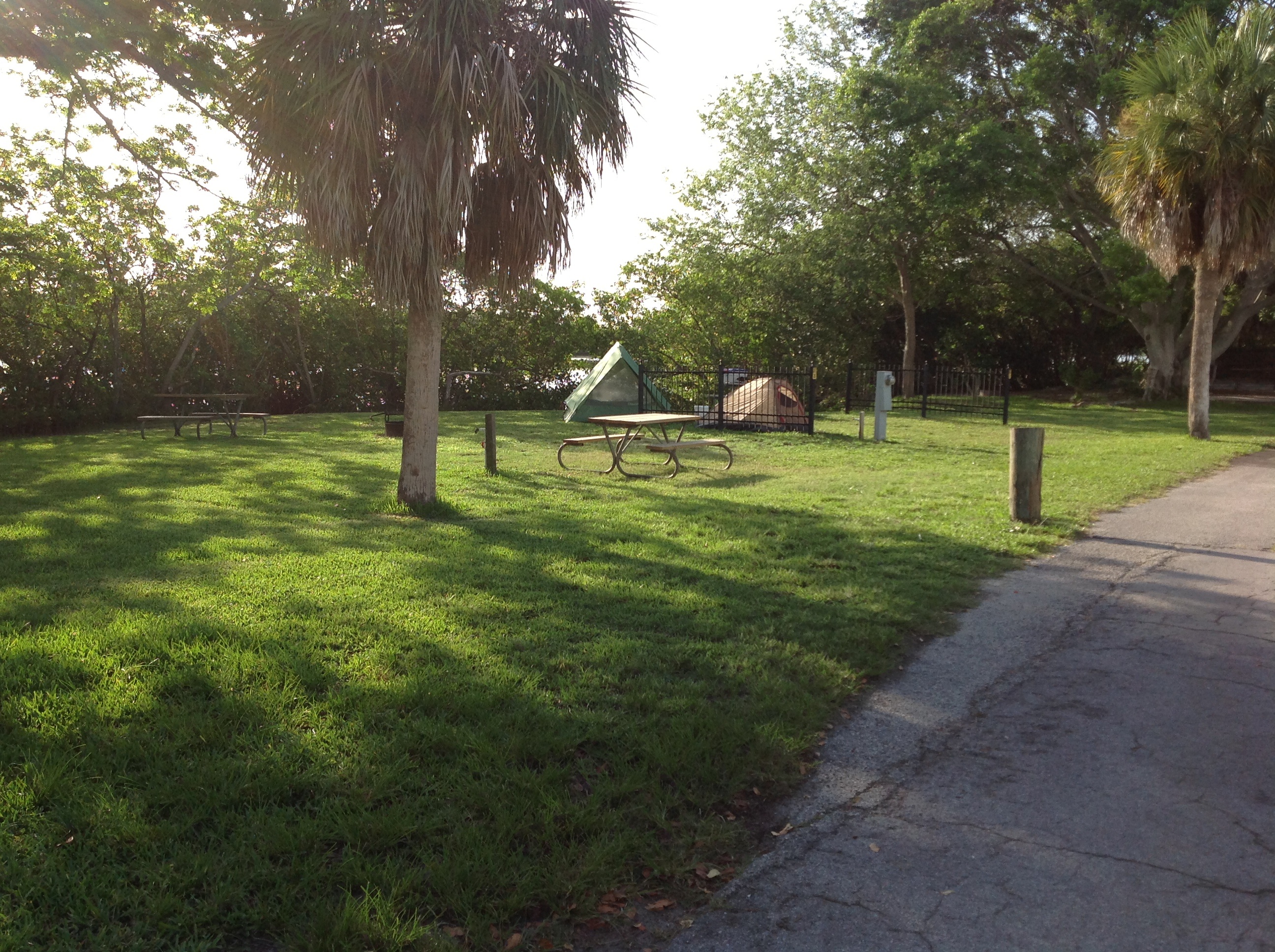 Day 2: Drove for about 15 hours and arrived in St. Petersburg about 10:00pm, so had to set up our tents in the dark. We stayed at the St. Petersburg/Madeira Beach KOA and had a beautiful tent site–right on the water, in a quiet park of the campground. This was a well-run, quiet campground–probably much busier in the winter. In the heat of June, there were not many other campers. Here’s our tent site: