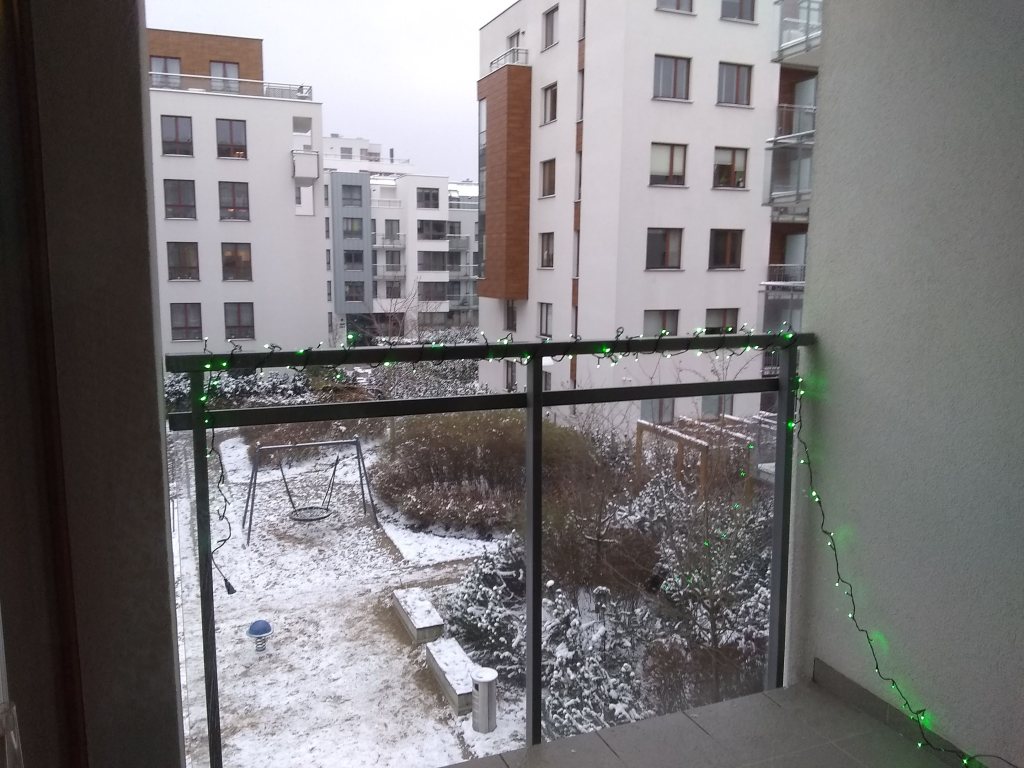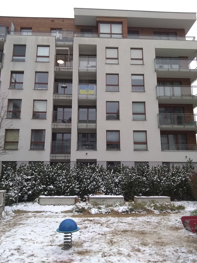 I bought some cheerful green Christmas lights to put on our little apartment balcony. Cheerful lights are good because the sun now sets at 3:30pm. The green lights are hard to see in the photos. Our balcony is the one below the Ukrainian flag balcony.