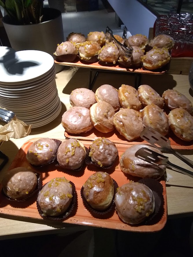 Later that day, we took a tram to a downtown workshop, and I noticed long lines at all the bakeries we passed. The Poles getting their pączki! At the hotel where our workshop was being held, there was a “break table” for participants, featuring water, tea, coffee…and pączki!