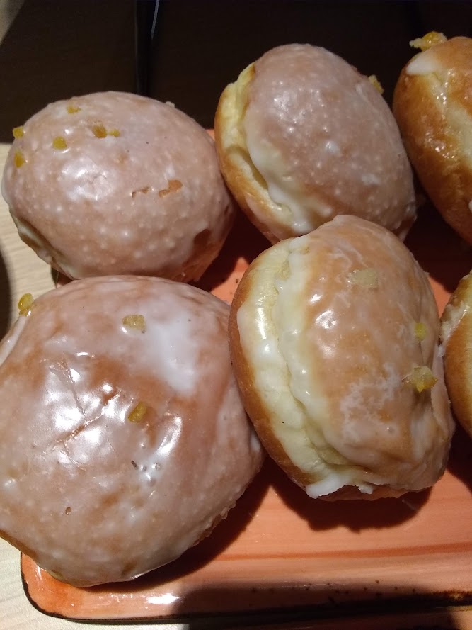 The pączki here in Poland are better. The dough is lighter and each of the fillings I tried (vanilla custard, raspberry, coconut) were delicious. Some were topped with chopped nuts, candied fruit pieces, a chocolate glaze. Yum.