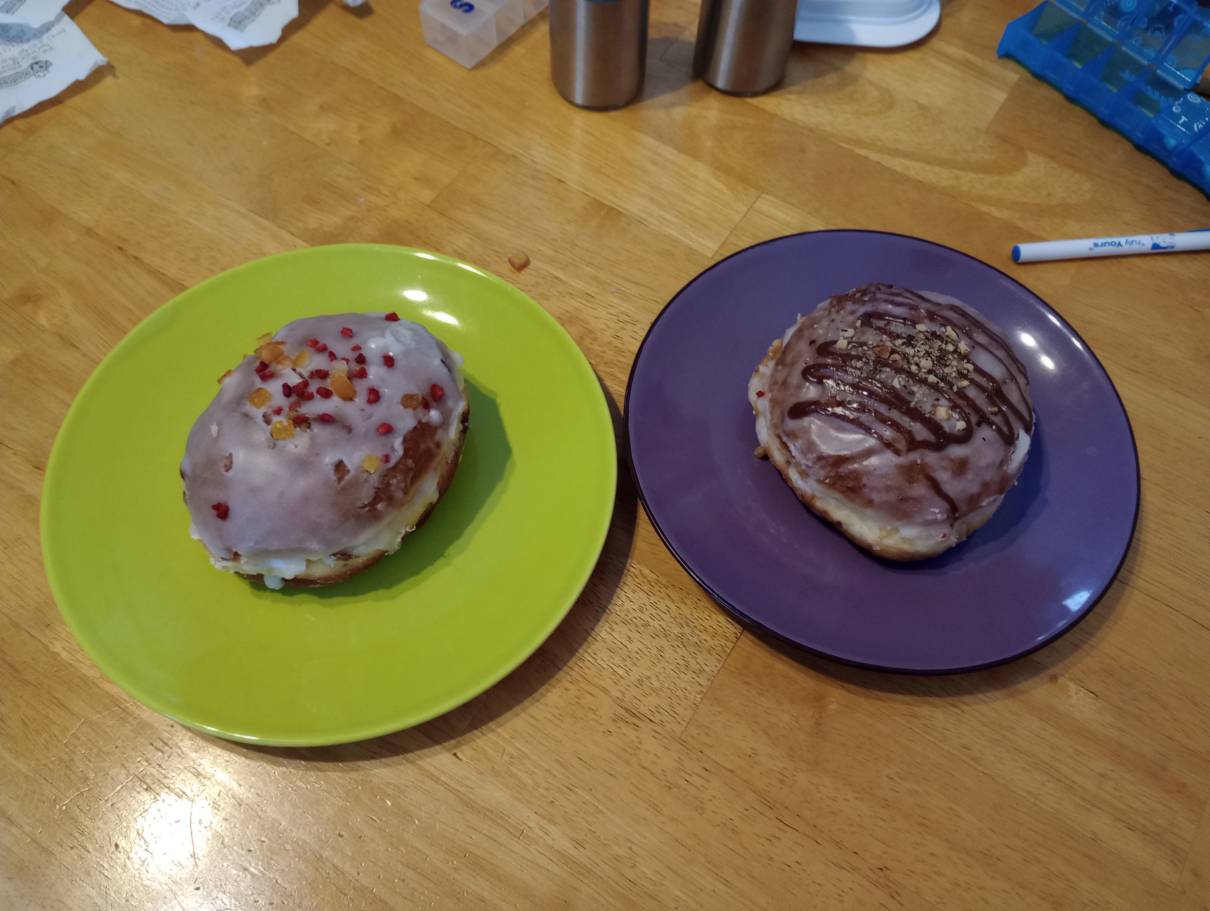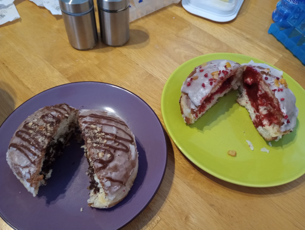 Everyone in Poland is buying and eating these doughnuts today. Friends of ours bought some yesterday and gave us two. We had those with our coffee this morning (not pictured). While out doing chores this afternoon, I passed a piekarnia (bakery) that was advertising its pączki. They had only about six left. I bought a chocolate and a “rose” which might actually be raspberry.