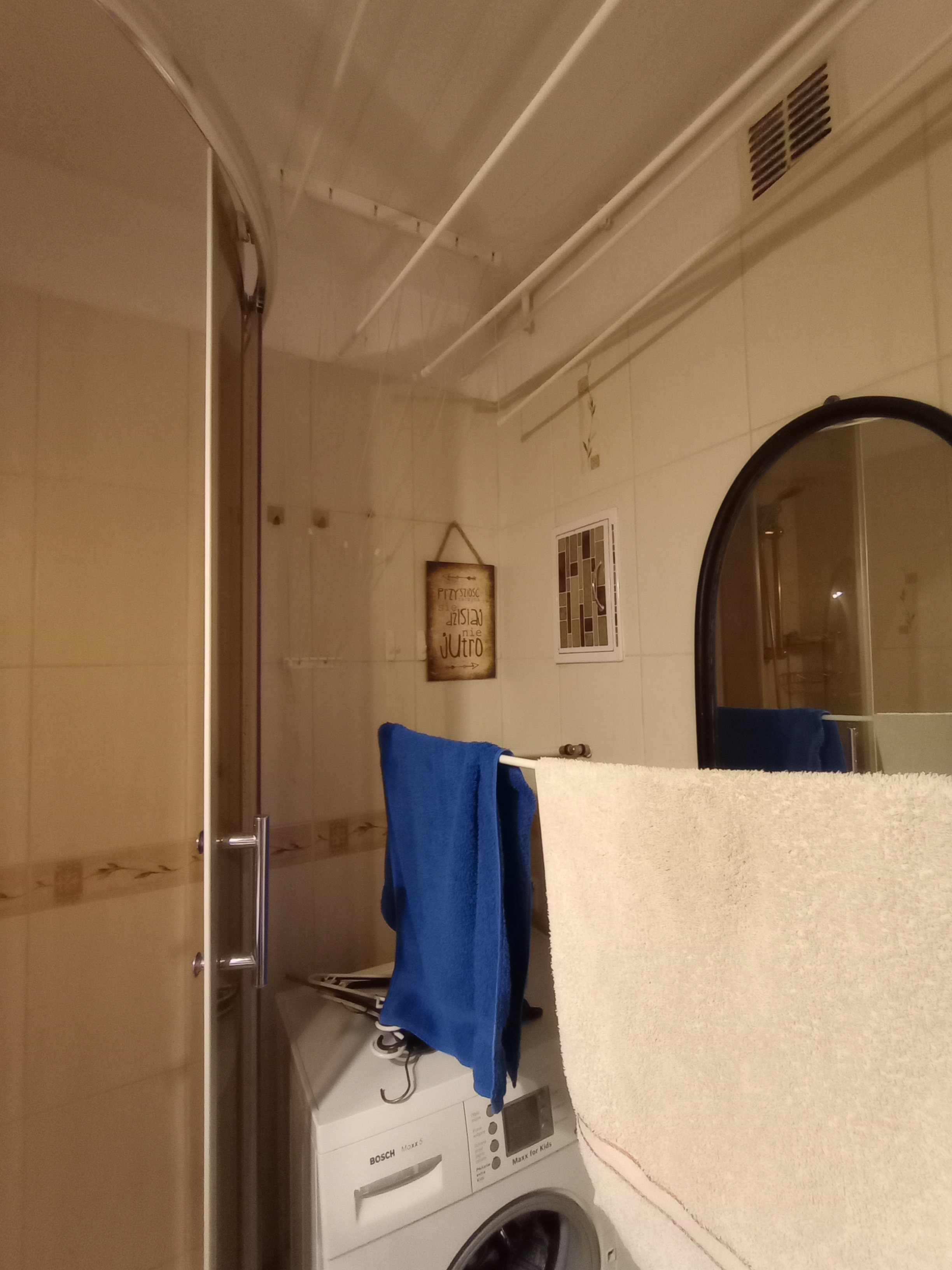 - Our tiny bathroom has both a washing machine and a system for hanging wet clothes. I love this too.