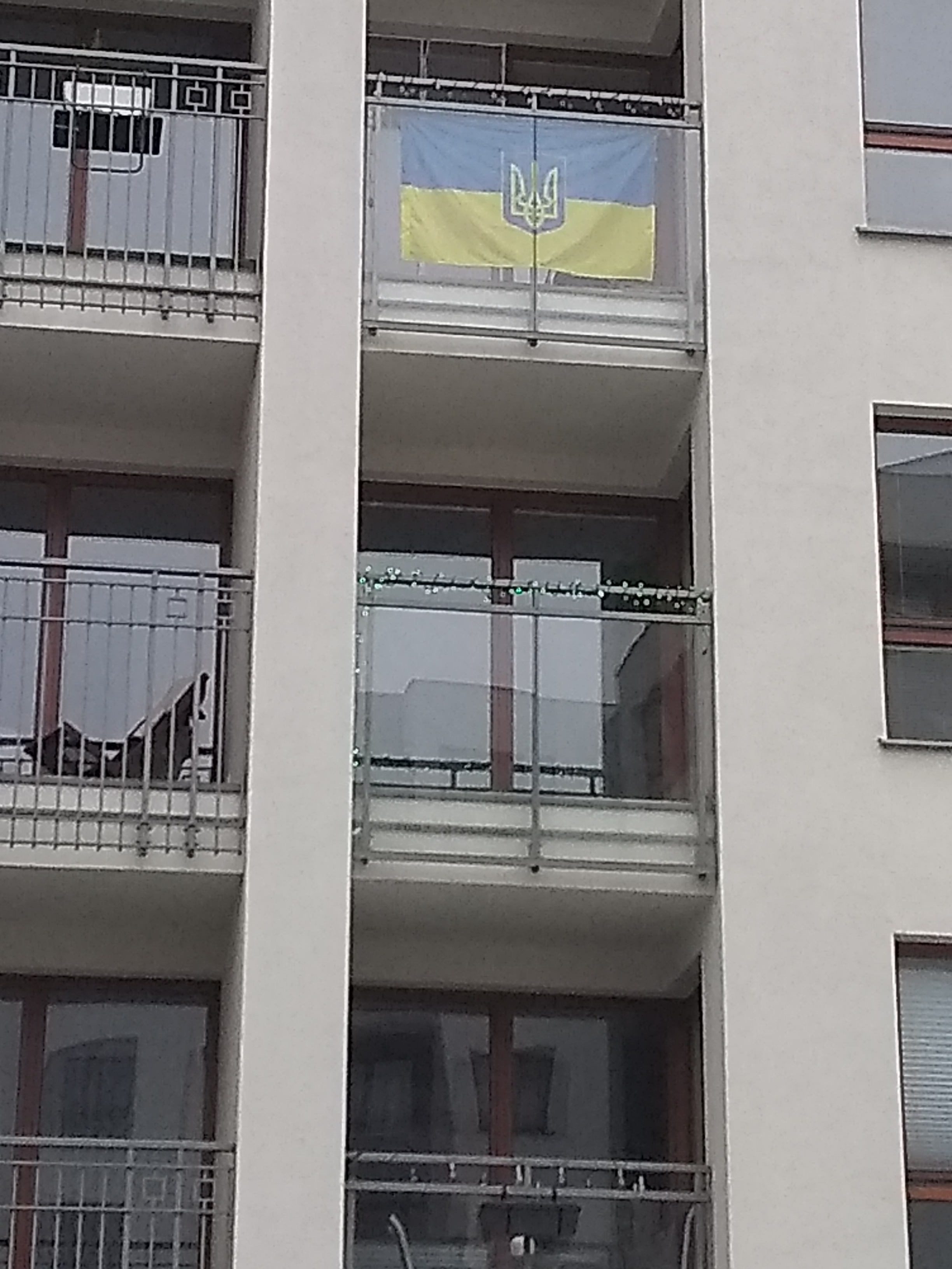 I bought some cheerful green Christmas lights to put on our little apartment balcony. Cheerful lights are good because the sun now sets at 3:30pm. The green lights are hard to see in the photos. Our balcony is the one below the Ukrainian flag balcony.