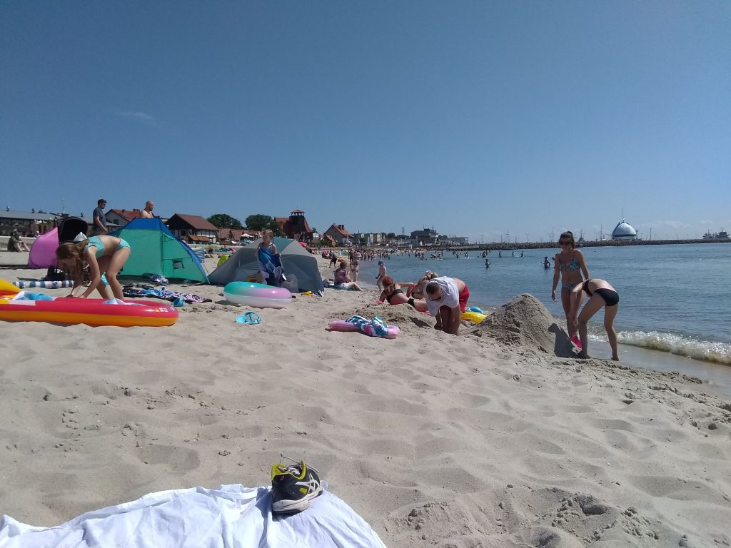 We wandered Hel a little, then headed for the beach. We found a place to put on our swimsuits, did a bit of swimming, sunbathing, and people watching. I enjoyed watching the family next to us create a large, moated sand tower that the youngest child (not pictured, age about 3) eventually climbed and destroyed. I wonder if that is how the Japanese got the idea of Godzilla.